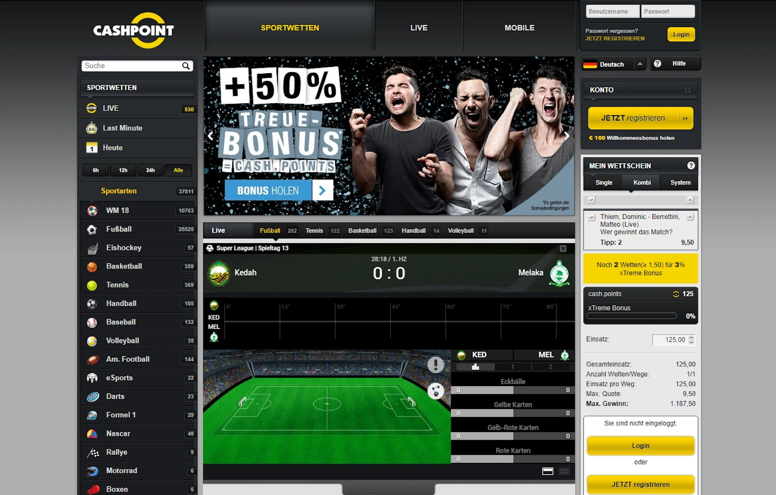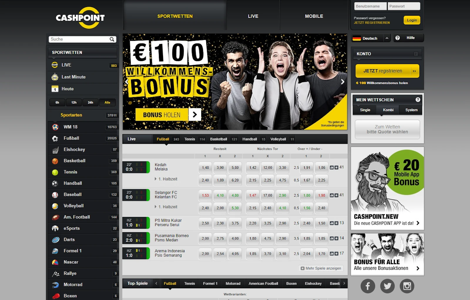 Schon beim Betreten der Startseite fäll der Schwerpunkt von Cashpoint ins Auge: Sportwetten, Live-Wetten und Mobile Wetten. Die wichtigsten Wetten finden sich im großen zentralen Bereich, während man im linken Menü die verschiedenen Sportarten, auf die man wetten kann, findet. Rechts gibt es den Wettschein, Bonus-Angebote und Informationen zum Benutzerkonto.